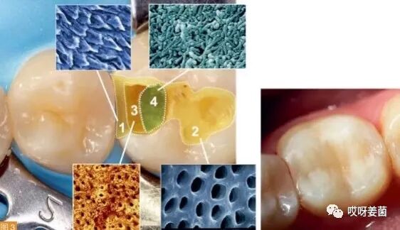准备修复的洞内不同牙齿基底:牙釉质(1)、未改变的牙本质(2)、龋病影响的牙本质(3)、髓周龋坏感染的牙本质(4)