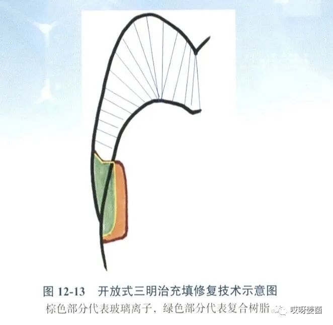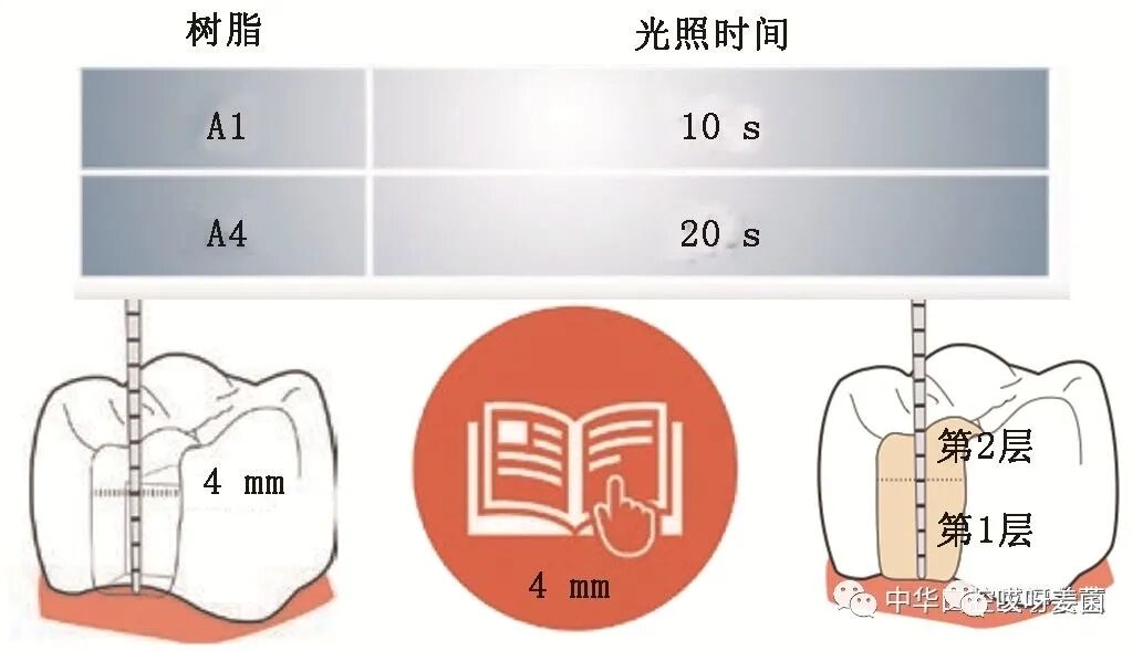 注:第1层填充4 mm后光固化;第2层填充后再行光固化图示 大块复合树脂光固化厚度不宜大于4 mm