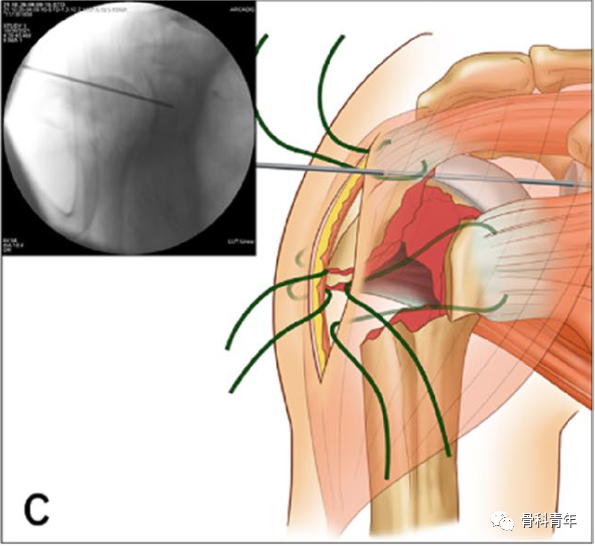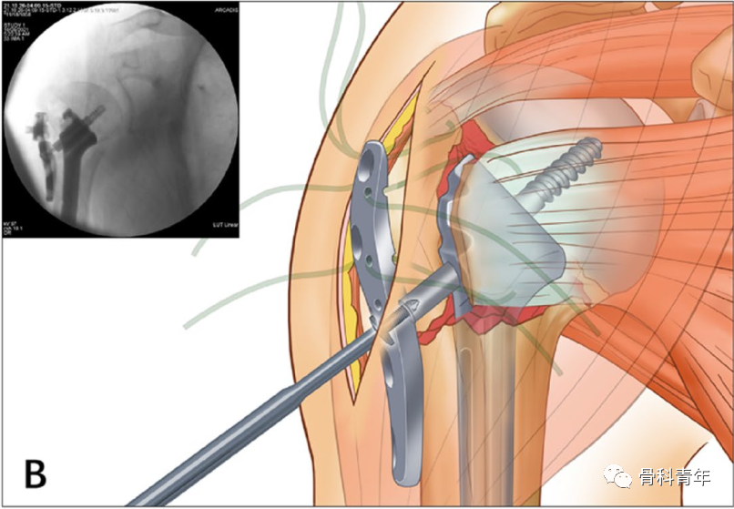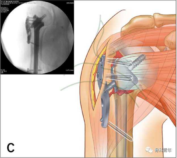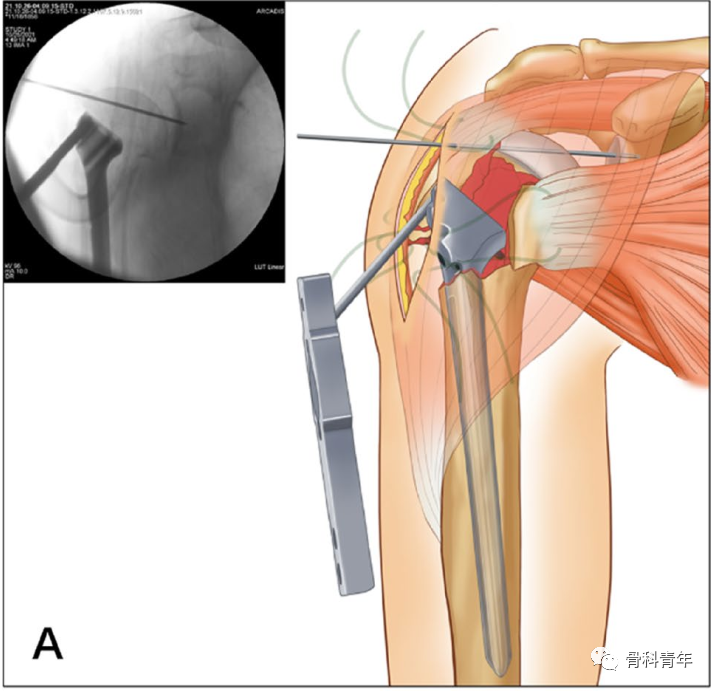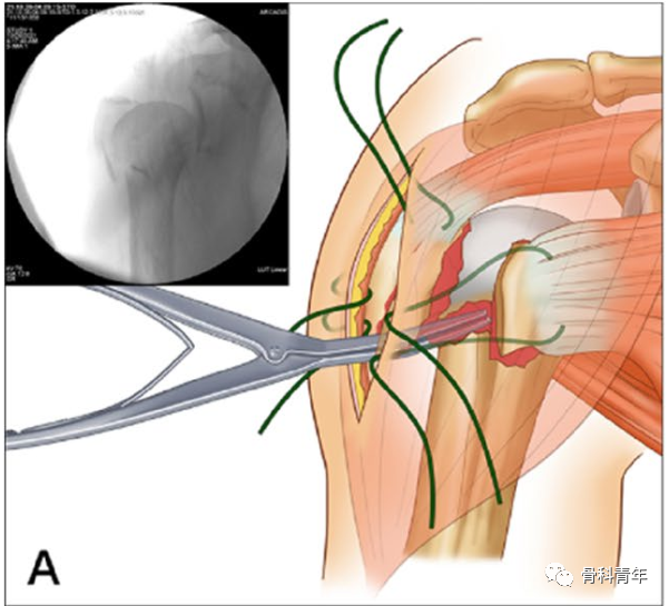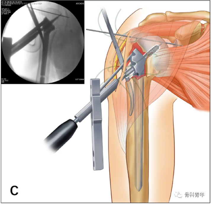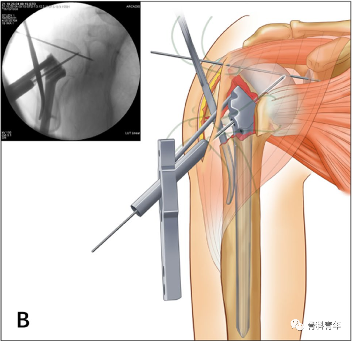 3. 将肱骨关节面复位,并临时固定至肩关节盂。