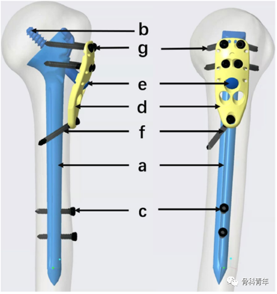 该钉-板系统包括以下部件。a, 髓内支撑钉(intramedullay support nail,ISN);b, 空心拉力螺钉;c, ISN锁定钉;d, 锁定钢板;e, 加压螺钉;f, 钢板远端锁定螺钉;g, 钢板近端锁定螺钉。