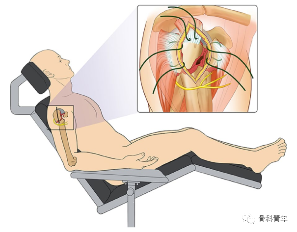 1. 体位与入路:常规沙滩椅位,劈三角肌入路。