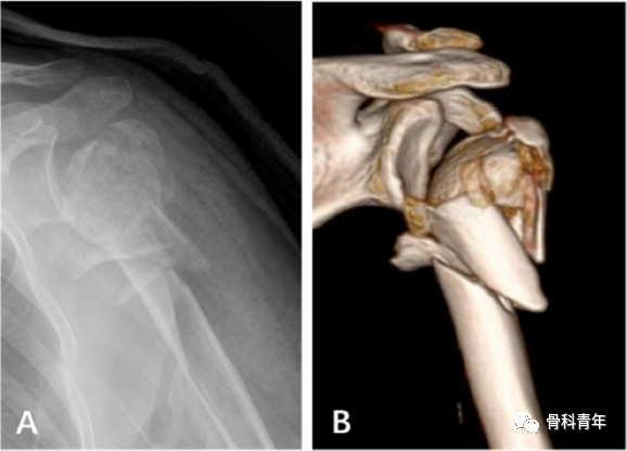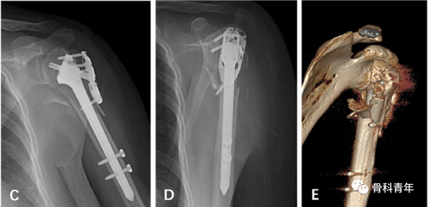 术前X线及三维重建提示肱骨近端四部分骨折。