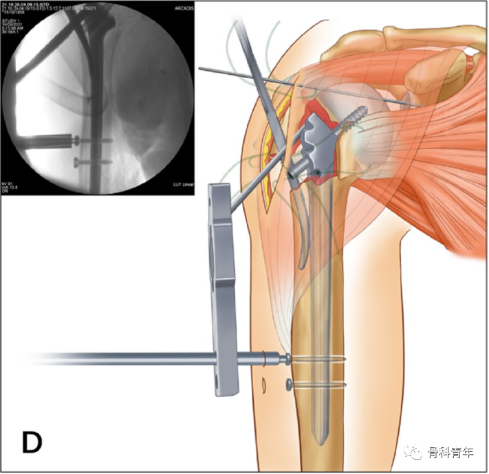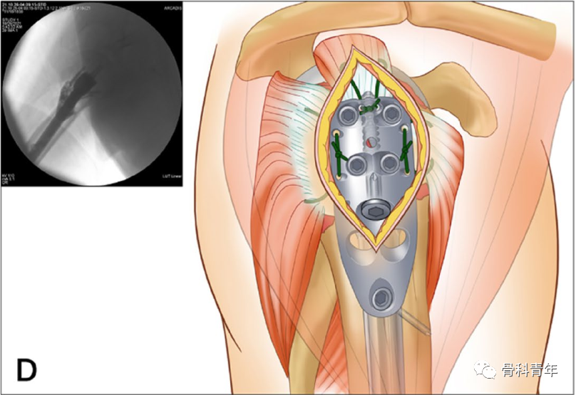 7. 大结节复位,将预留缝线穿过钢板对应孔,经钢板置入加压螺钉。