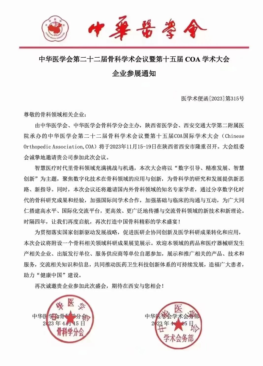 由中华医学会、中华医学会骨科学分会主办,陕西省医学会、西安交通大学第二附属医院承办的中华医学会第二十二届骨科学术会议暨第十五届COA国际学术大会(Chinese Orthopedic Association,COA)将于2023年11月15-19日在陕西省西安市隆重召开。大会组委会诚挚地邀请贵公司参加此次会议。