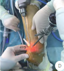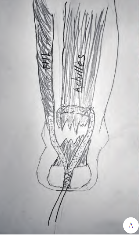 屈肌腱远侧的游离端,也用骨科 2 号线编织,在关节镜辅助下由入路 1 逆行拉入跟腱腱鞘内,在戳枪的辅助下屈肌腱由外向内横行贯穿跟腱近侧断端腱腹,后拉紧屈肌腱,使跟腱远近侧断端对合。用 16 号套管针过 PDS II可吸收缝线,对屈 肌腱穿过跟腱腱腹的区域以及屈肌腱腹与跟腱断端间区域进行缝合加固(见下图)。