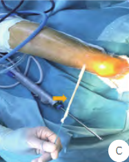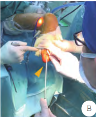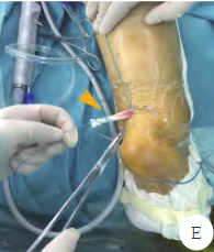 必要时,可行术中 X 线机透视来确保足够的骨道长度及后方保留足够的骨质。用6cm空心钻在导针导引下钻骨道,直到钻头露出跟骨结节下方的骨皮质。在关节镜监视下用导针将骨科5号线(No.5 Ethibond sutures)引入骨道,并作为牵引线将肌腱反折端拉入骨道内(图A),牵引线头端于足底透皮穿出,以踝关节跖屈位拉紧,调整屈肌腱张力,直到患侧跟骨结节与健侧等高为止,后在关节镜监视下,沿 1.2mm导针拧入 1 枚 6mm羟基磷灰石挤压螺钉以固定。