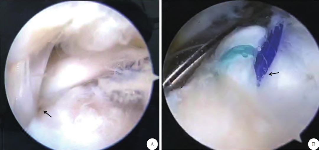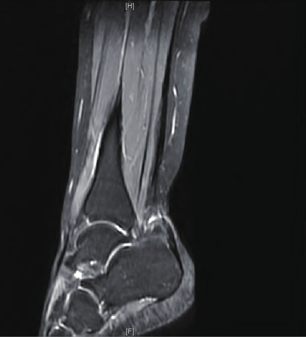 患者,女性,16岁,自发性跟腱断裂2年,既往有风湿性脉管炎病史,长期使用激素。查体:患者跛行,跟腱止点处压痛阳性,跟腱止点上2cm处可扪及明显空虚感,Thompson征阳性,患侧跟骨结节较对侧延长约3cm。术前核磁共振检查:可见跟腱从止点上 2cm处断裂,近侧断端回缩约 2cm(图 1)。由于患者存在内科相关的基础疾病及长期激素用药史,因而采用常规切开修复陈旧性跟腱断裂的手术的并发症风险极高,因此在关节镜辅助下对陈旧性跟腱断裂进行了屈肌腱转位加强重建修复治疗。