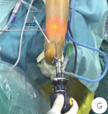 图G. 用戳枪将屈 肌腱游离端贯穿跟端近侧断端腱腹,拉紧固定。