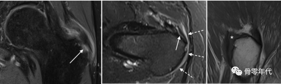 71岁女性臀小肌腱部分厚度撕裂(a和b中的箭头):(a)脂肪饱和冠状质子密度加权图像和(b)轴位T2加权脂肪饱和图像,伴有明显增厚和相关的小粗隆滑囊炎(b,虚线箭头)。(c)臀小肌腱在矢状位T1加权像上信号强度增加(星号)反映潜在的肌腱病变。