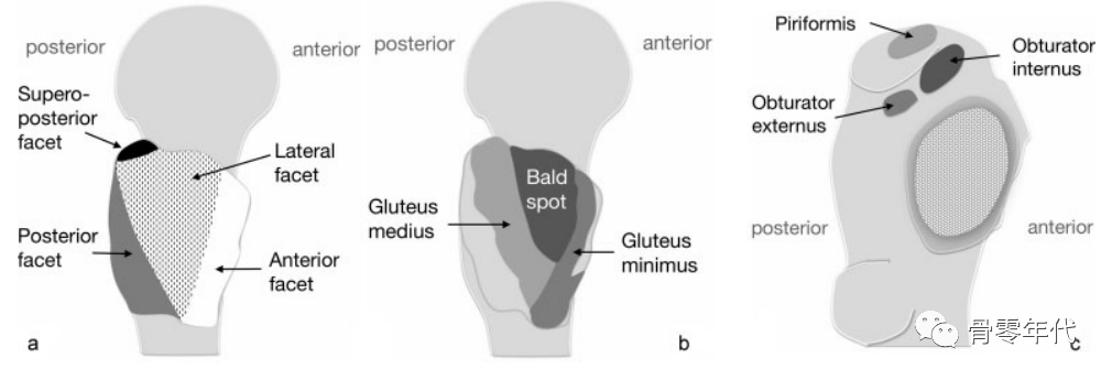 (A)前部、侧部、后部和上后部。(B)臀小肌腱和臀中肌腱附着处及无肌腱插入处的秃发点。(C)外旋转肌腱的附着点。请注意,为了更好地显示,股骨头和颈部已被移除。