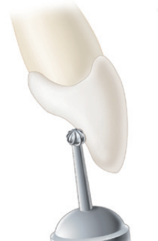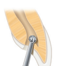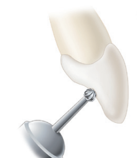 外部轮廓完成后,改变车针方向,车针的角度从垂直于舌/腭侧表面旋转为平行于牙根长轴。