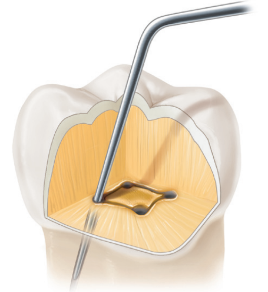 探诊探查根管口,对于后牙来讲,根管口应位于开髓洞形的各角落,且根管口都应位于髓室底,而不应该在轴壁上形成类似于鼠洞样结构。