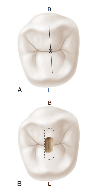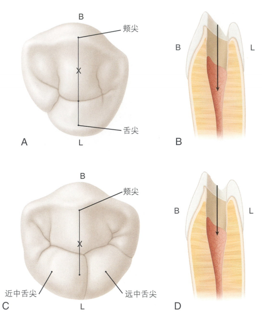 因此必须调整进入点位置以补偿此倾斜。在下颌第一前磨牙中,起始位置在两牙尖连线上,颊尖舌斜面的中点处。下颌第二前磨牙需要调整的较少,因为它们的舌倾程度较小。该牙的人点位于颊尖与两舌尖间舌沟的连线上,颊尖舌斜面的1/3处。
