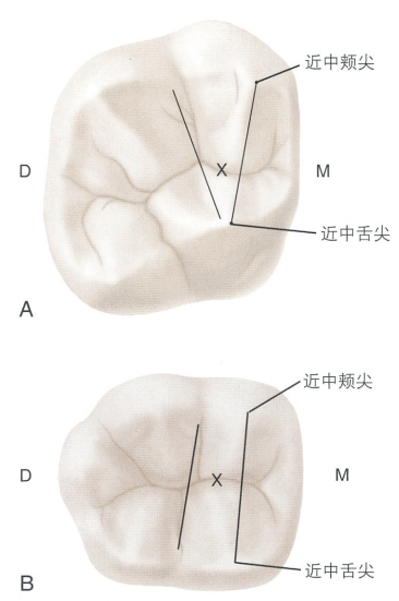 为了确定磨牙开髓洞形的起始位置,必须确定其牙冠外形近远中向和冠根向的界限。
