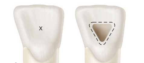 将需要根管治疗的患牙上龋坏组织和修复体完全去除,通常便于形成合格的开髓洞形。但是,如果牙齿完好无损,则必须确定开髓的起始位置。后牙髓腔通常位于釉牙骨质界水平中心。因此,在上颌前磨牙中,确定开髓洞形轮廓的入点位于牙尖之间的中央沟。