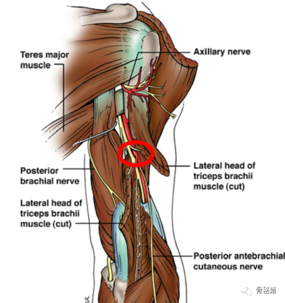 原理:桡神经在后方固定绕过肱骨从三头肌下方通过