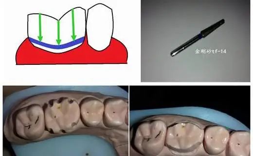 第二步,金刚砂车针TF-14,是一根又大又粗的金刚砂车针。为了避免边缘飞边,车针的直径最好大于肩台的直径,那么TF-14是不错的选择。颊侧3条,舌侧3条,6条定深预备沟不用多,不可少。最后,按照牙体形态,连接定深沟。如上图。