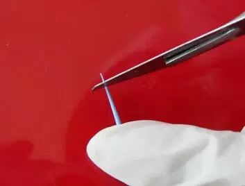 2、主牙胶尖选择:与主锉一致的主牙胶尖能进入根管,并在根尖区1~3mm有紧缩感。否则,应逐次切除牙胶尖尖端0.5mm,直到获得合适的长度和紧缩感。然后,用主牙胶尖X线照相进行评价。如果主尖不合适要用手术刀切不能用剪刀剪,切出来的断面是圆的,剪出来的断面是扁的。