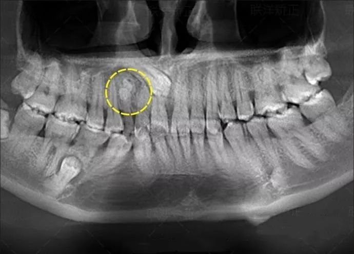 患者是30多岁的年轻男子,红色标记那颗牙松动,要求拔牙,开始嫌麻烦不愿拍片,后来经过再三劝说还是拍了片。结果把所有人包括他自己都吓了一跳。估计是良性,具体还得去医院住院手术做病理检查,所以大家不要忽视一张片子带来辅助检查的重要性。