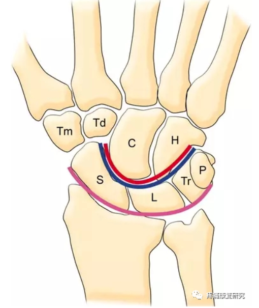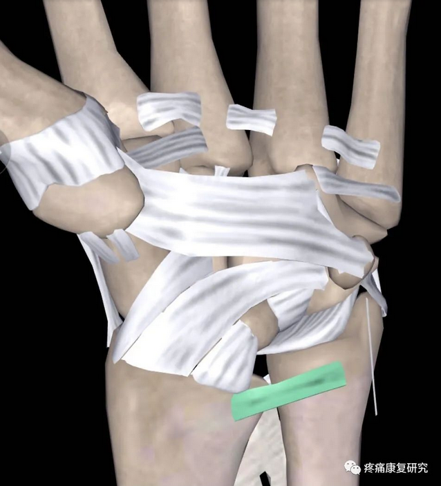 TFCC 组成包括三角纤维软骨(TFC)、半月板同系物、尺侧副韧带、桡尺远端掌背侧韧带、尺三角韧带、尺月韧带、尺侧腕屈肌腱鞘、桡尺三角韧带等,其中 TFC 是其主要结构。