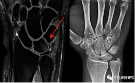 左图MRI:显示月骨尺侧近端存在骨水肿区域;右图X线:显示尺骨正变异。