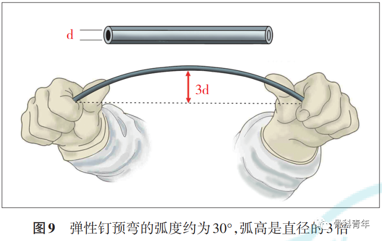 (二)弹性钉预弯的弧度约为 30°,弧高是直的3倍,其顶点位于骨折端(图9)。