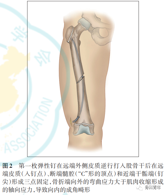 将第一枚弹性钉预弯成“C”形,经股骨干远端外侧皮质逆行打入髓腔,依靠其弹性在远端皮质(入钉点)、断端髓腔(“C”形的顶点)和近端干骺端(钉尖)形成三点固定;骨折端向外的弯曲应力大于肌肉收缩形成的轴向压应力,因此产生向内的成角畸形(图2)。