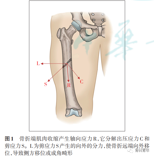 对斜形骨折由于剪应力作用导致轴向不稳定而出现短缩畸形和侧方移位(图6)。