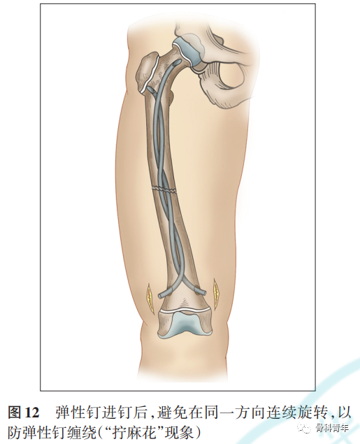 对股骨干和胫骨干骨折,进钉时无论是顺时针或逆时针旋转弹性钉,在打入过程中都要向相反的方向转回同样的角度,避免在同一方向上连续旋转而产生缠绕(“拧麻花”现象)[9-10](图12)。