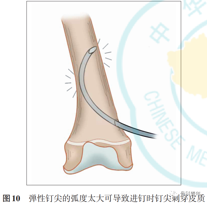 为保持两枚弹性钉的弧度一致,可同时进行预弯。对骨干上段或下段骨折,应适当调整弹性钉“C”形的顶点。钉尖弧度不可太大,否则在进钉过程中钉尖容易刺穿皮质(图10)。