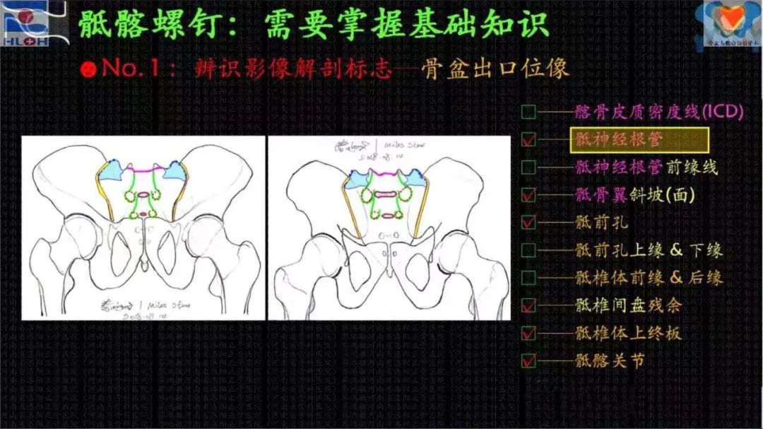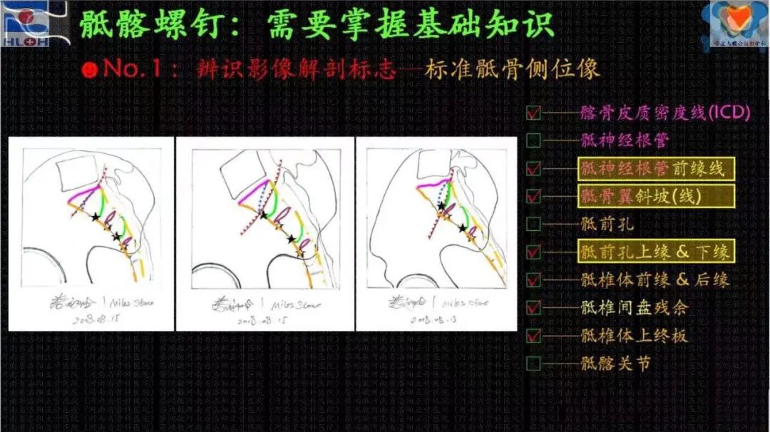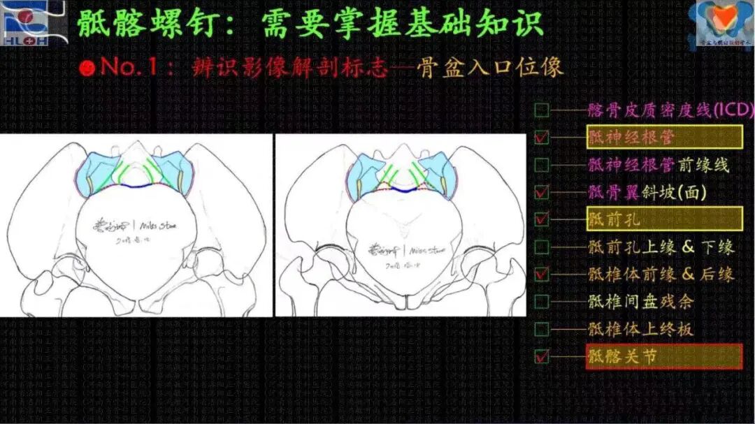 骶髂螺钉经皮置入技术的高难度和高风险的极端,在医者之心的支撑下,不再那么遥不可及、高不可攀,因为我们剥茧抽丝般地抽离出和置钉操作顺畅性和安全性相关的影像解剖学标志——标准骶骨侧位像及骨盆出入口位像上,髂骨皮质密度影(iliac cortical density,ICD)、骶神经根管特别是其前缘线、骶椎体前及后缘线、骶骨翼斜坡、骶前孔及其上下缘、骶椎体间残存的椎间隙、骶1椎体上终板、骶髂关节等——并应用它们判断骶1/2节段内骶髂螺钉骨性通道(斜向/平向),建立导针进针点,调整导针指向。