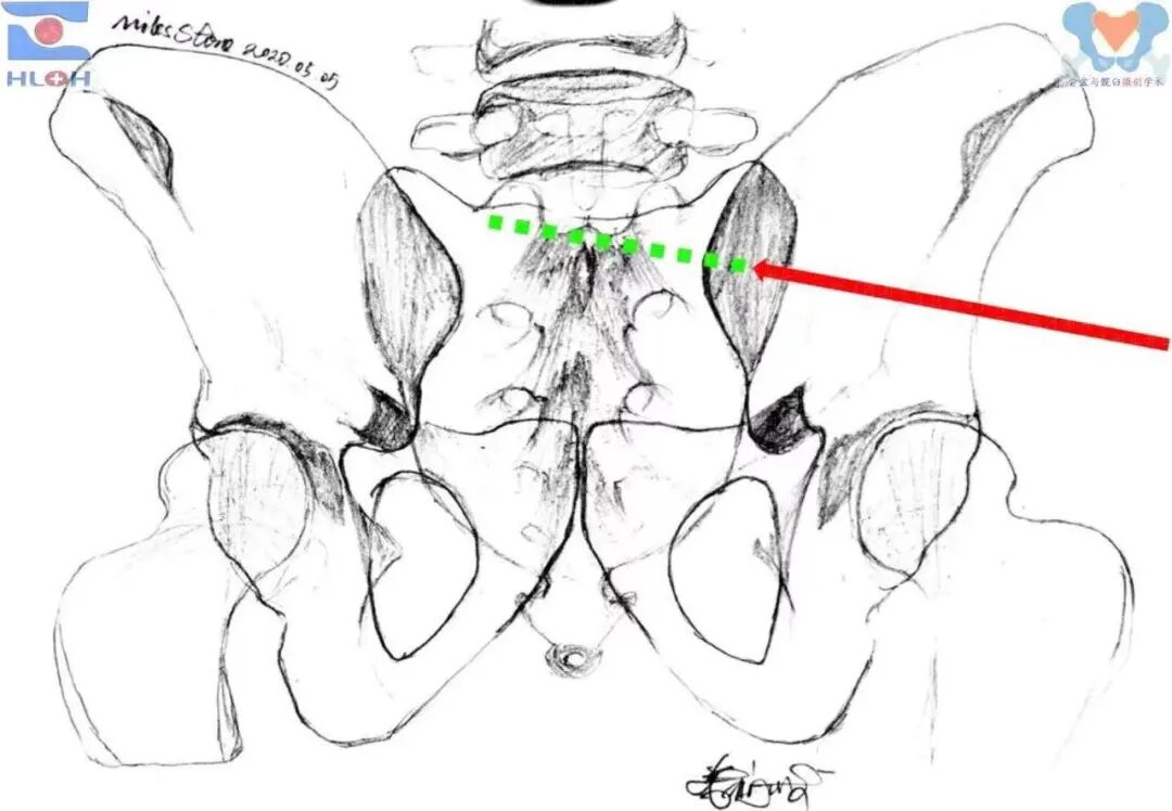 绿箭:骶1平向骶髂螺钉、红箭:骶1斜向骶髂螺钉