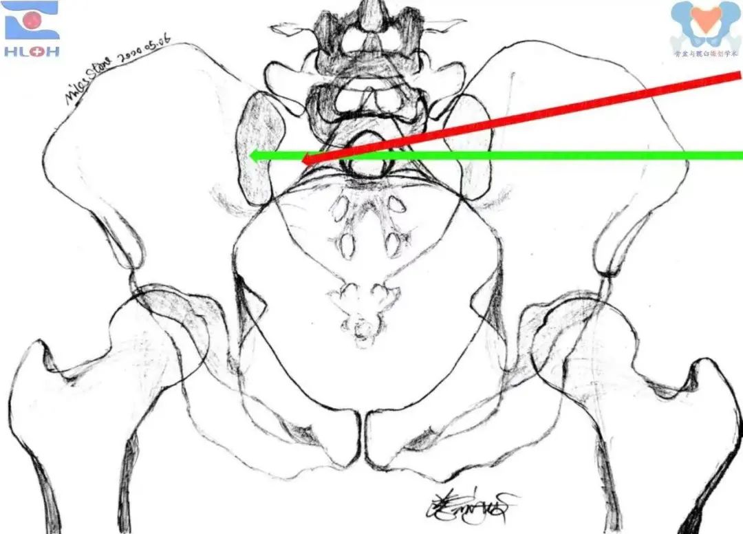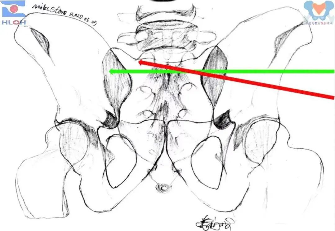 传统的导针指向调整方法(标准骨盆出口位像)绿箭:骶1平向骶髂螺钉、红箭:骶1斜向骶髂螺钉