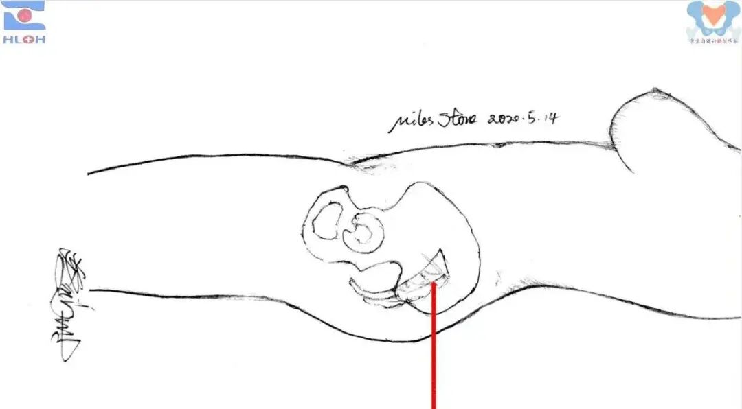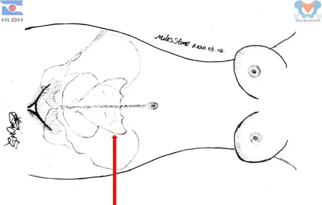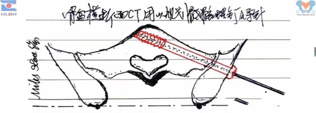 简化、精准且安全的导针指向调整方法调整导针至骨盆横断面内(导针垂直于肚脐与耻骨联合间的皮肤色素沉着线)
