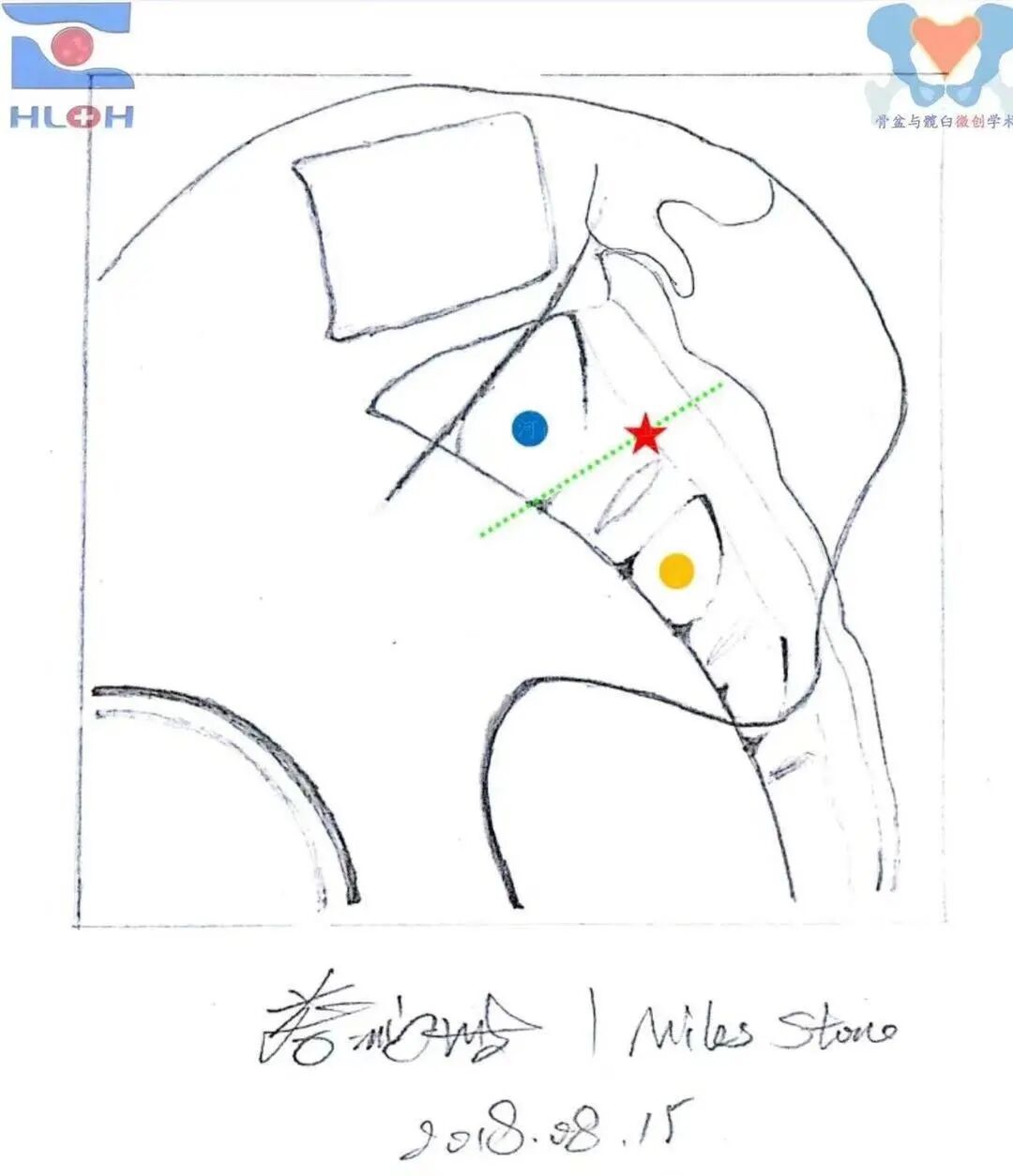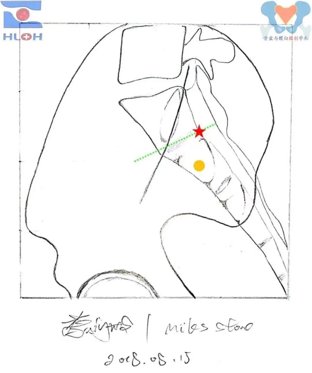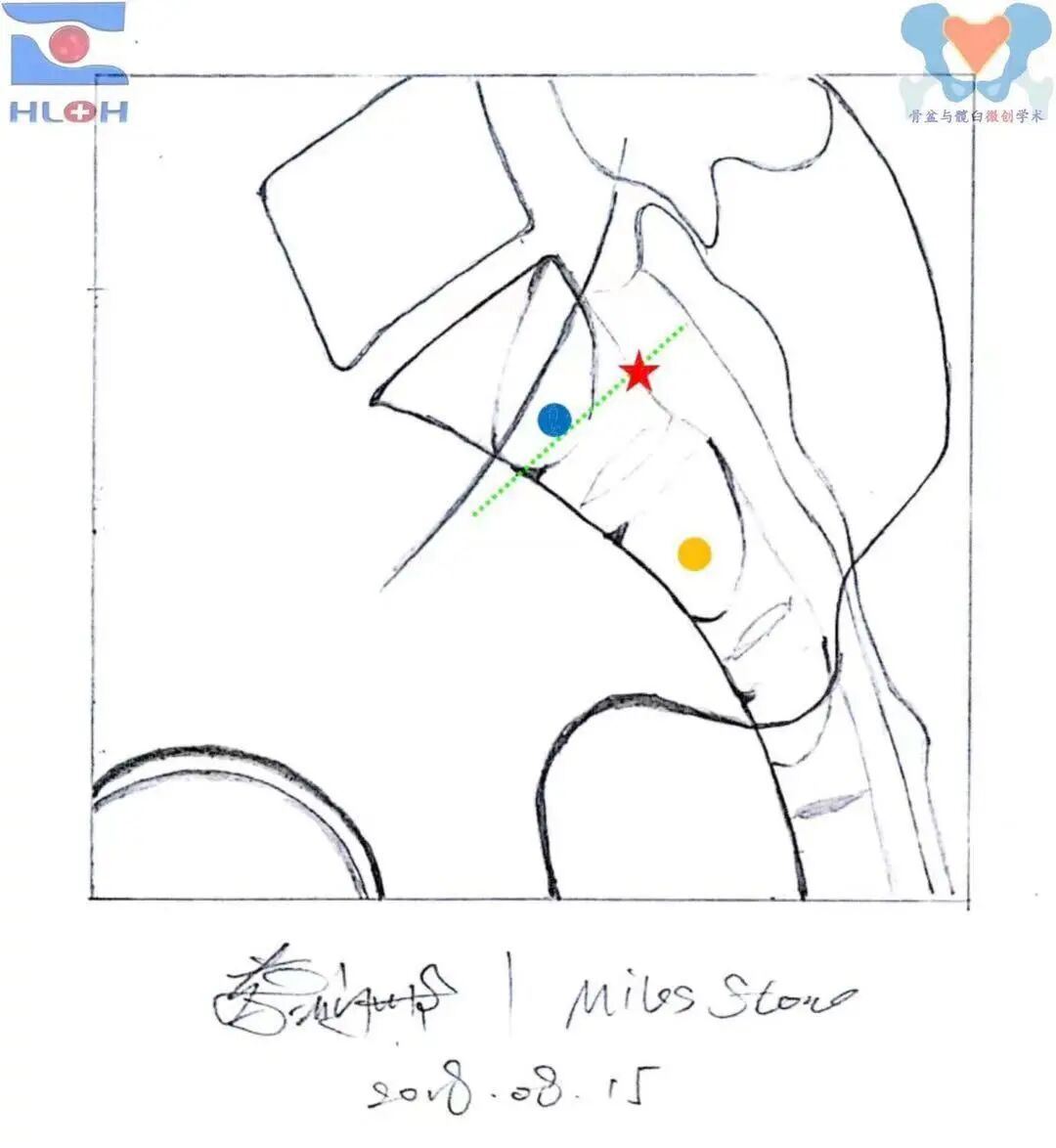 红星:骶1斜向骶髂螺钉(后跨骶髂关节)、金点:骶2平向骶髂螺钉(穿过骶髂关节)