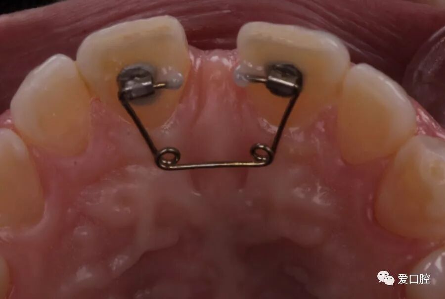 ▲我们使用简单弯制的弹簧可以帮助分配中线的间距,并安放在患者口内的腭侧,之所以这样做,是因为这种方式患者比较容易接受,可以从图片中发现一个细节的处理,就是弯制的起始端和末端有一树脂球,目的是为了防止刮伤软树脂,其二是为了固定和防止两端移位,好了,7-10天后复诊