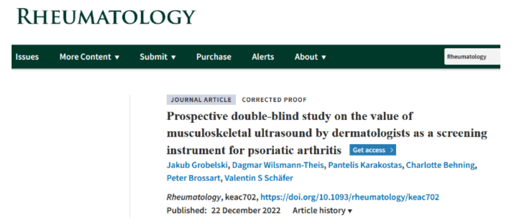 Grobelski J, Wilsmann-Theis D, Karakostas P, Behning C, Brossart P, Schäfer VS. Prospective double-blind study on the value of musculoskeletal ultrasound by dermatologists as a screening instrument for psoriatic arthritis [published online ahead of print, 2022 Dec 22]. Rheumatology (Oxford). 2022;keac702. doi:10.1093/rheumatology/keac702