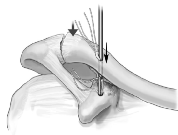 2.导针定位,在锁骨远端内侧3cm处自背侧向喙突基底部用4.5mm空心钻头钻孔。