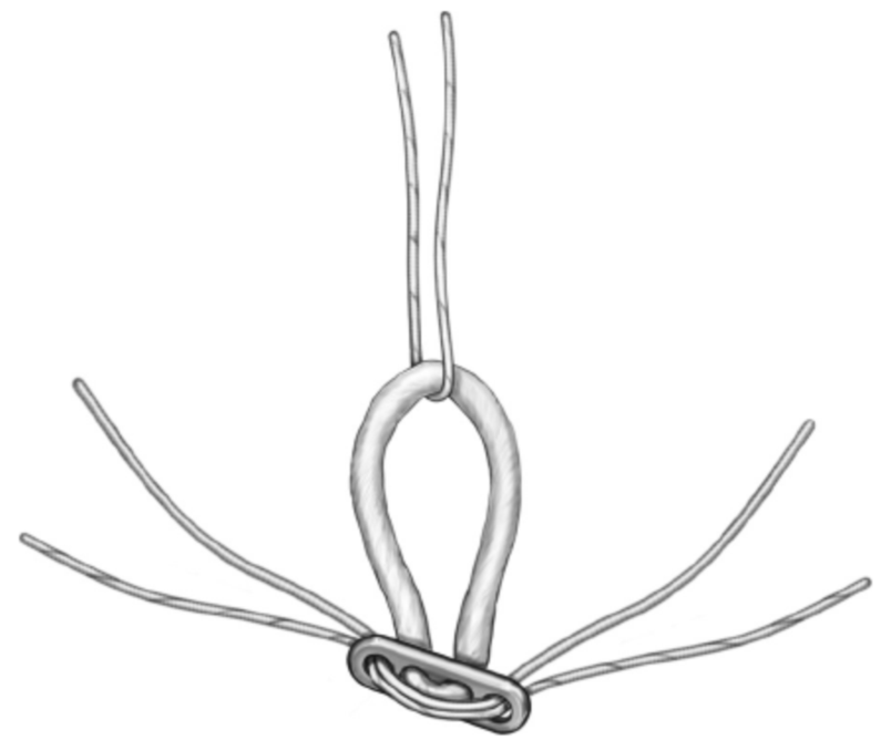 3.假体准备,在钮扣钢板的外侧和内侧两孔依次穿入2根5号爱惜邦线,袢上穿入1根缝线留作牵引。(测量喙锁间距,选择袢长度要略大于测量值的带袢endobutton钢板。)