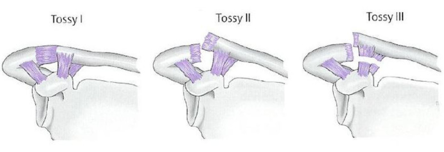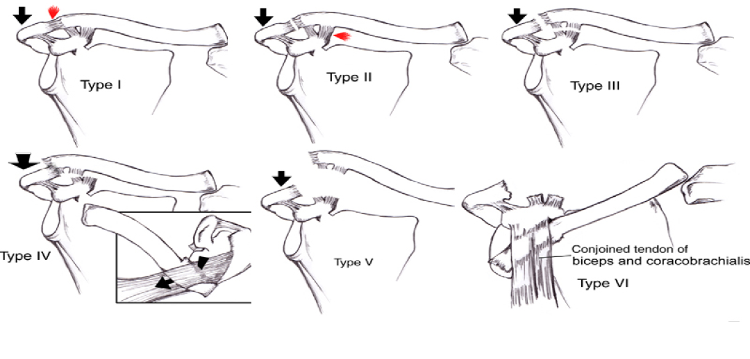 V型:肩锁关节韧带破坏,喙锁韧带破坏,肩锁关节脱位,三角肌和斜方肌与锁骨远端分离;