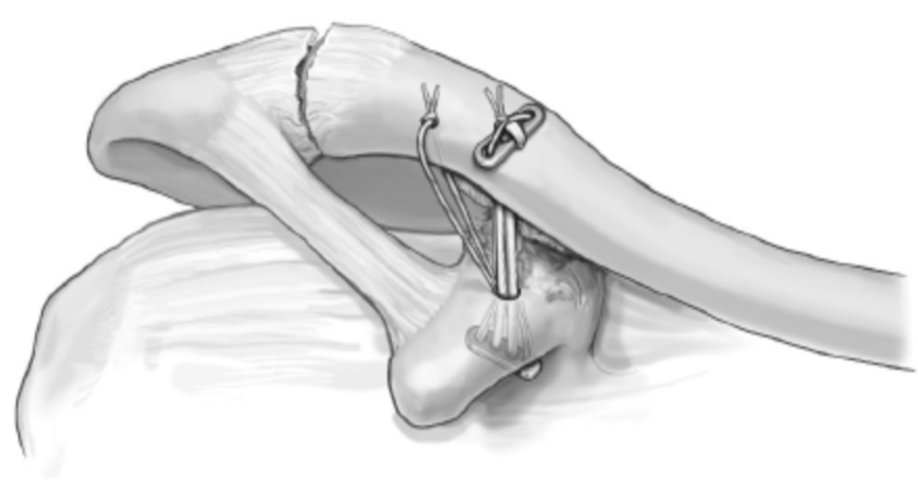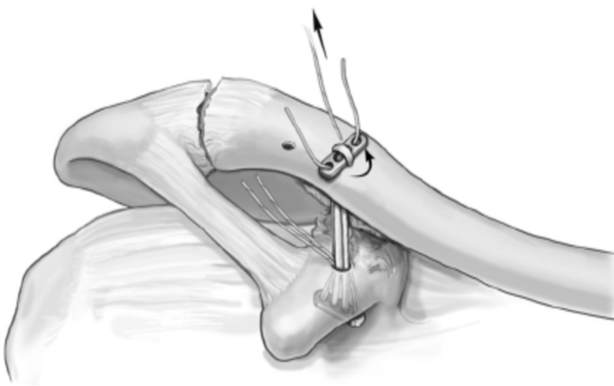 5.沿锁骨上钻孔的前外侧约1cm处另钻一孔,将内侧缝线打结在该孔上重建斜方韧带。这样就把喙锁韧带重建了。