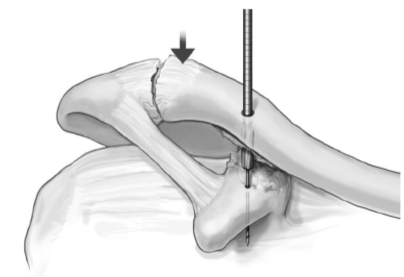 (在锁骨远端钻孔时,钻孔位于锁骨前中1/3处,这样垂直进针才会打入喙突基底正中。)