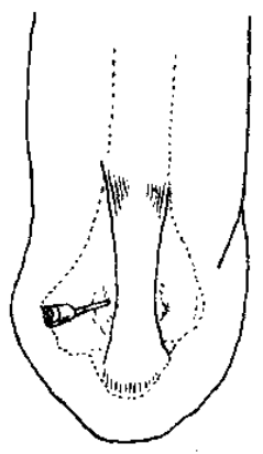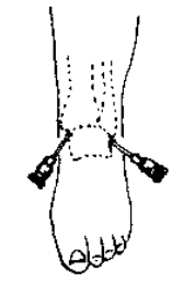 紧依外踝或内踝尖部之下,向内向上刺入,经踝部与相邻的距骨之间进入关节(图6)。