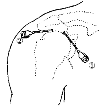 也可紧依肩峰与肩胛冈所成的角的外侧下针,向内并稍向上进入(图1)。