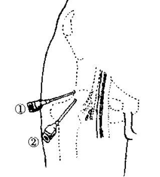 紧依喙突尖部外侧进针,针的方向向后,同时向上并向外(图1)。