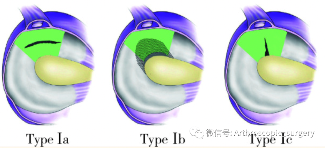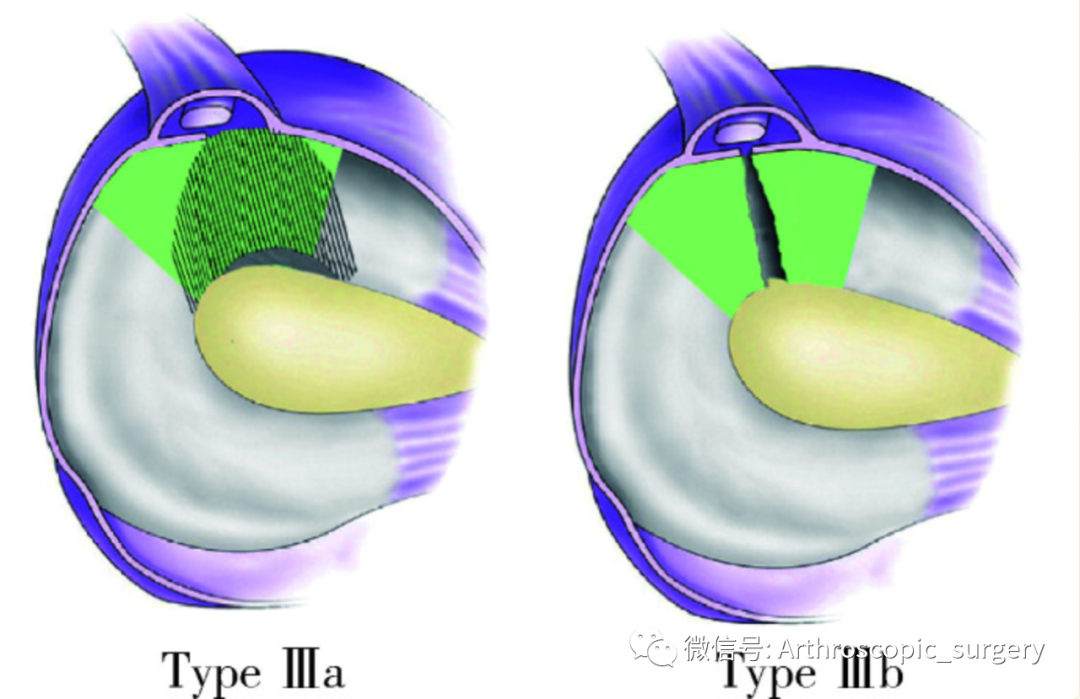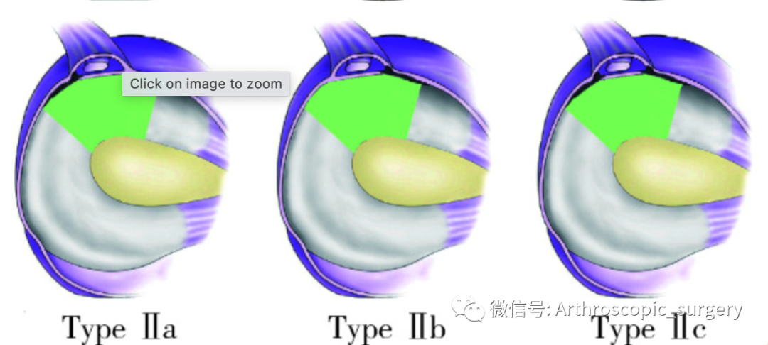 解剖上因为腘肌腱的存在,外侧半月板在中后部被腘肌腱裂孔所间隔,并不与关节囊连接,形成界限清晰呈游离状态的“外侧半月板-腘肌腱切迹”,与腘肌腱动态性接触,因此,其活动度大,血供较差,容易损伤,常并发于前交叉韧带损伤,以纵形撕裂多见。有学者将腘肌腱裂孔半月板损伤根据损伤类型及范围,进行了相应的分型