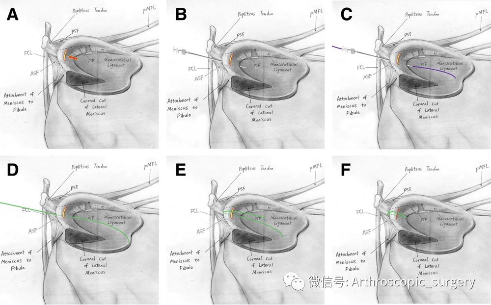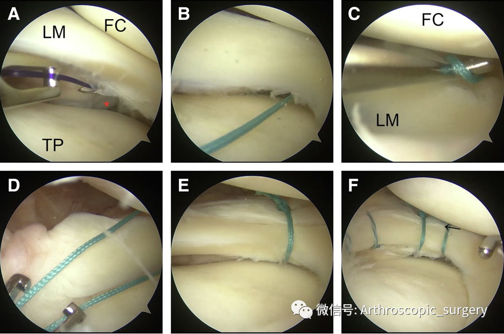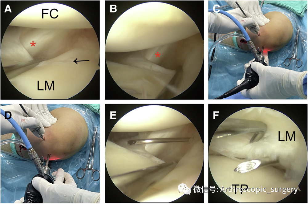 对于腘肌腱裂孔半月板纵行或者水平状撕裂的患者,图A/B中箭头所指的就是损伤部分,*是腘绳肌腱,FC是股骨外侧髁,LM是外侧半月板,常规选择4字位进行操作,关节镜置于外侧入路,内侧入路进行相应操作,D图中可以看到腰穿针从外侧进行缝合,在皮肤外选择同一穿刺口将腰穿针置入半月板下表面,引入PDSII缝线(当然我认为如果可以,也可以直接将高强线进行直接引入)