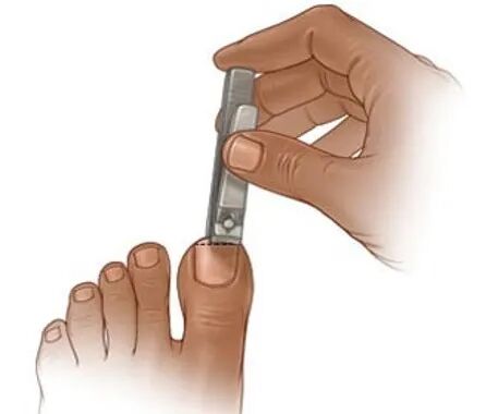 用能达到甲根最近端的小且扁的剥离器将甲板侧方1/4从甲床上掀起,然后用直剪剪出这部分趾甲。