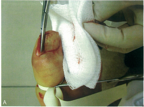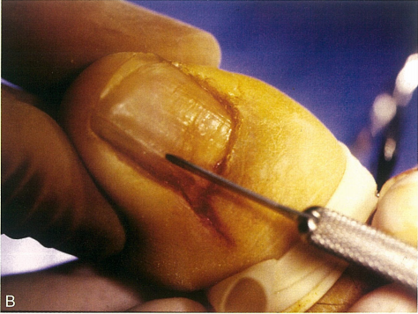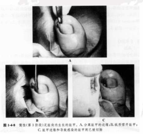 在炎症侧甲板方的1/4用一根小的角状探针或止血钳将指(趾)甲的外侧1/4自其甲床处掀起,用剪刀将指甲纵向减掉,弧形的剪刀尖不易伤及甲床。