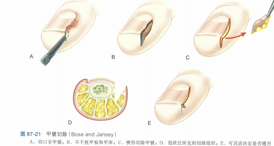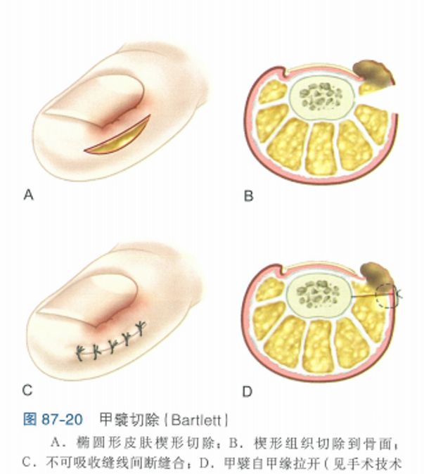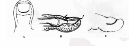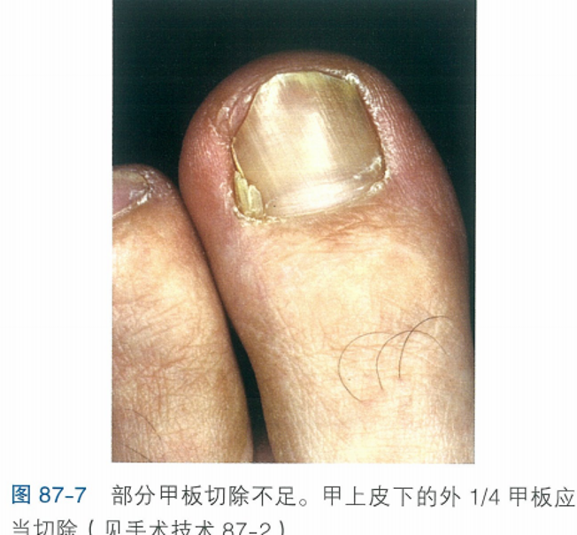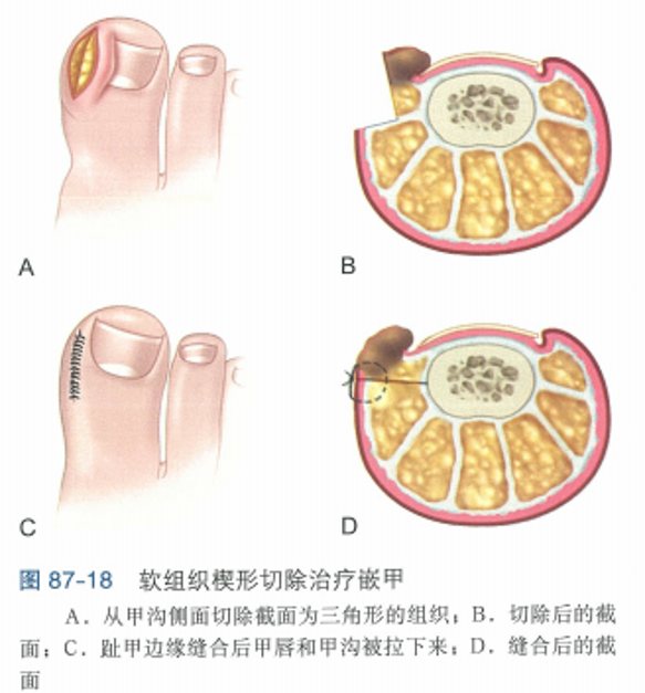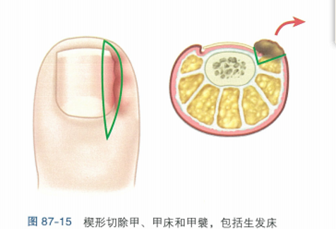 指(趾)甲是主要的侵犯性结构,而软组织是被侵犯组织,需要切除全部或部分指(趾)甲和甲床生发区。反之亦然,既然甲襞是疾病的罪魁祸首,手术目的就是切除或修正甲襞。